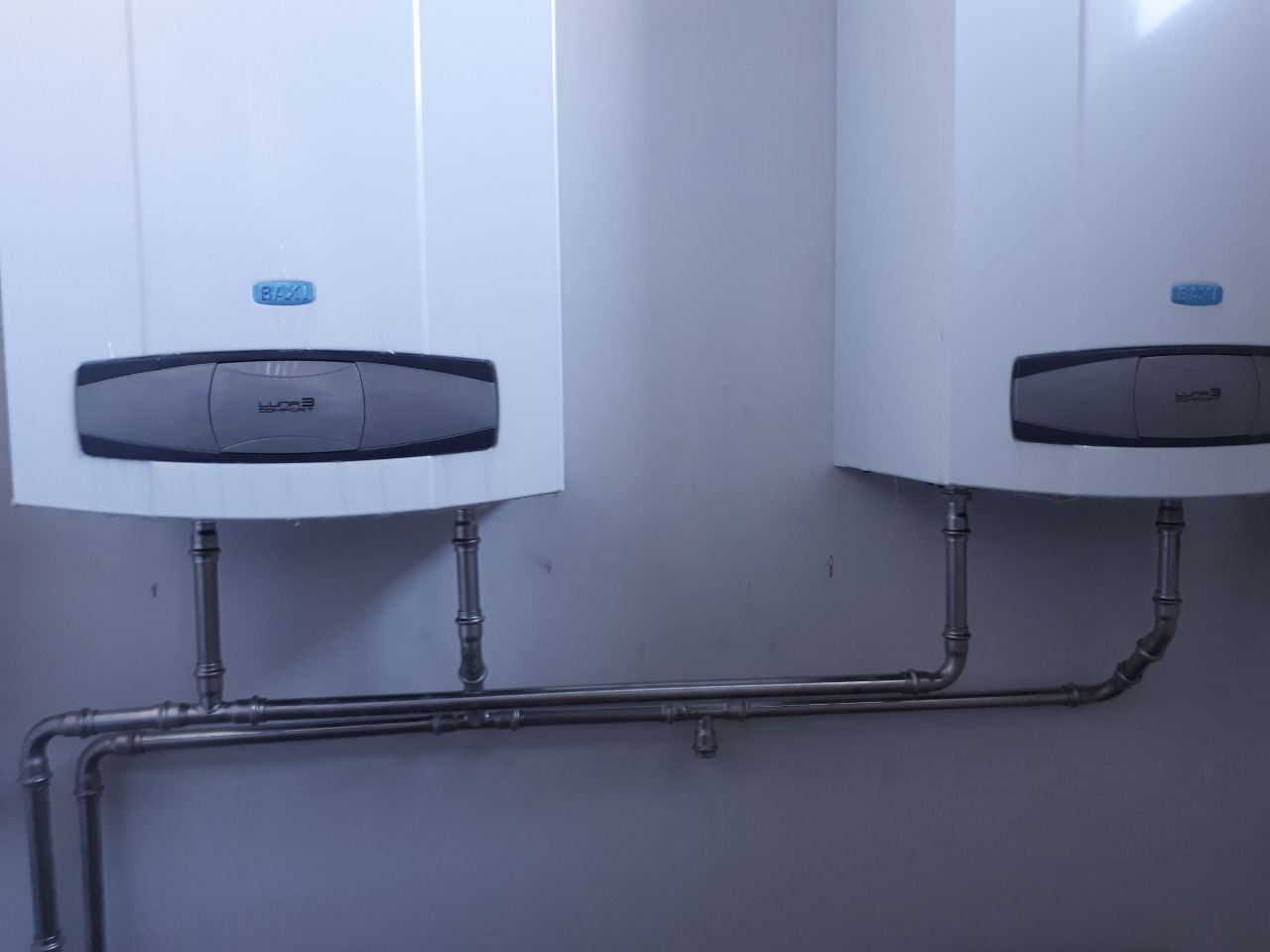 Установлен напольный газовый котёл 40 кВт, смонтирован дымоход, коллекторы на 4 контура, радиаторы и тёплый пол.