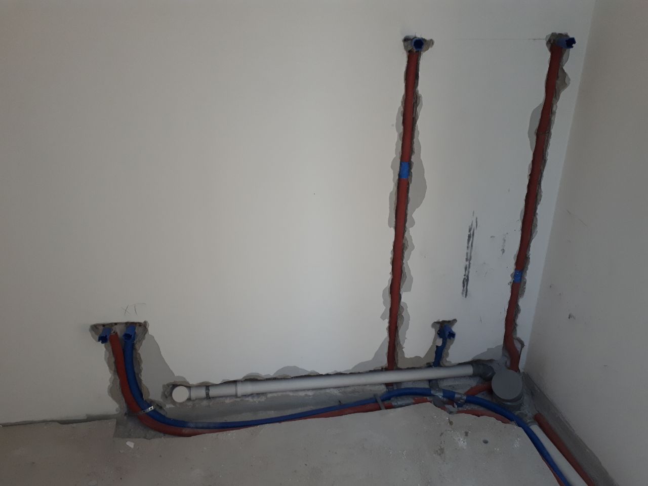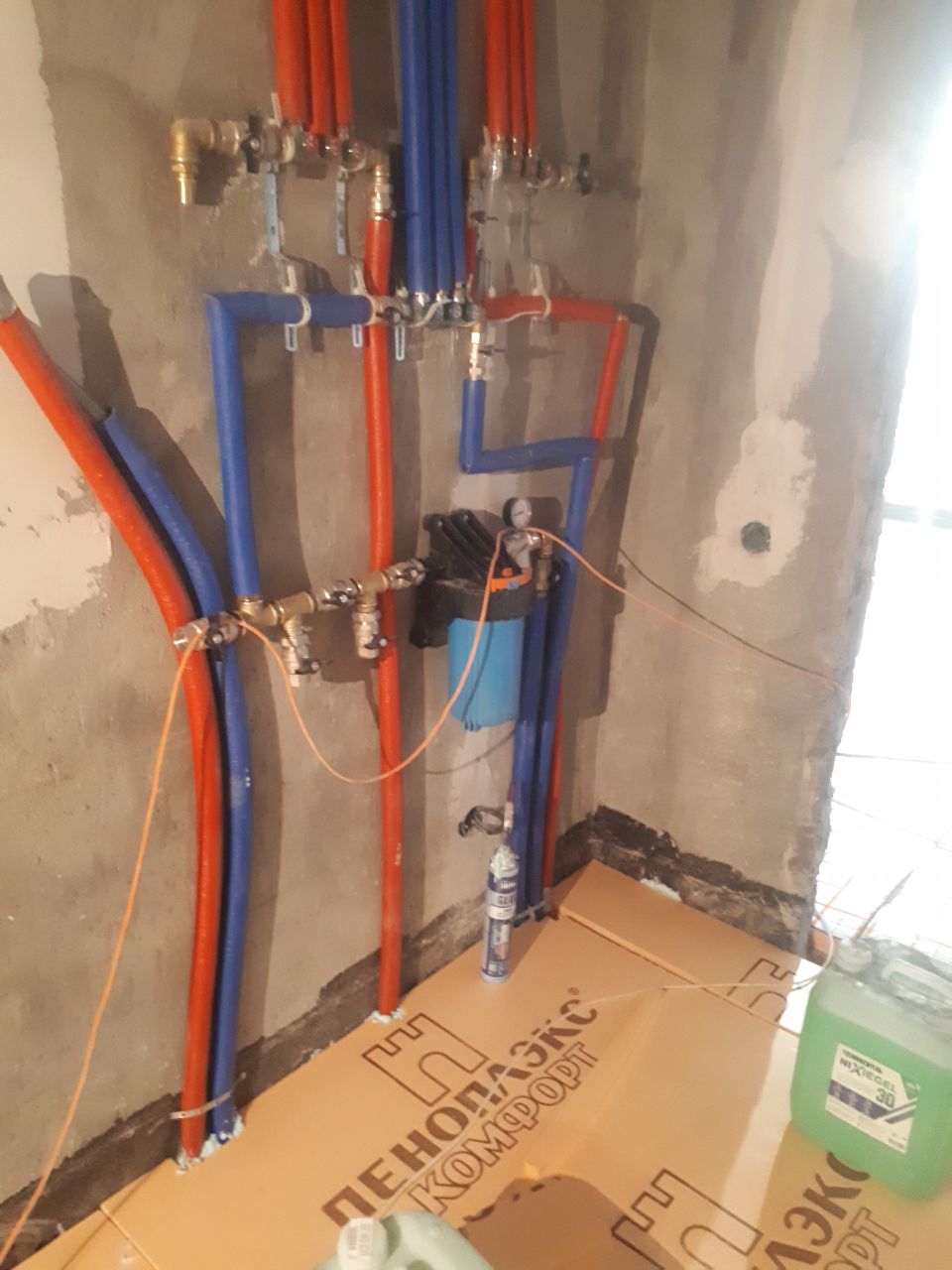 Установлены коллекторы тёплого пола, система рециркуляции ГВС с полотенцесушителями, система очистки воды, блок управления насосом. ХВС — по коллекторной схеме, каждый потребитель на отдельной линии.